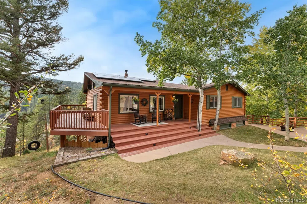 Welcome home to your own mountain cabin retreat! Situated on 5 acres with a breathtaking view of Riley Peak, this 4 bedroom, 3 bath home should not be missed by any potential homeowner who wants the benefit of quiet mountain living but only 5 minutes to a grocery store, 20 minutes to Littleton, and 45 minutes to downtown Denver. This property should also not be missed by those who want to be minutes from kayaking or fishing the South Platte River, gather with friends on a beach by the river, or hike the Cathedral Spires. Staunton Park is also minutes away! As for the home, the recently updated kitchen showcases two-tone shaker-style cabinetry complete with gorgeous limestone subway tile and custom countertops from a slab of leathered black granite and upgraded stainless steel appliances, such as an induction powered stove and a drawer microwave. The living room hosts a wood-burning fireplace with exquisite stone masonry, a centerpiece to the cozy space. The area also opens via a 13-ft wide sliding door into the back deck. Enjoy a cup of coffee with an incredible view of Riley Peak! The lower-level outdoor living space is complete with an outdoor jacuzzi tub, perfect throughout the year from cool summer nights to wintry days with light snow. The home also boasts an updated spa-like primary en-suite complete with limestone countertops, rain head shower and Carrera marble finishes. The lower level also has been remodeled with an entertainer in mind: a dry bar with ample wine storage and a pool table that comes with the purchase of the house. Outdoors, the property has many deer trails throughout and a 2-stall barn. The detached 2-car garage also comes with a large climate-controlled workspace upstairs, ideal for a buyer who has options to work from home. This retreat also comes with solar panels for sustainability and clean energy. The most remarkable mountain living experience awaits you.